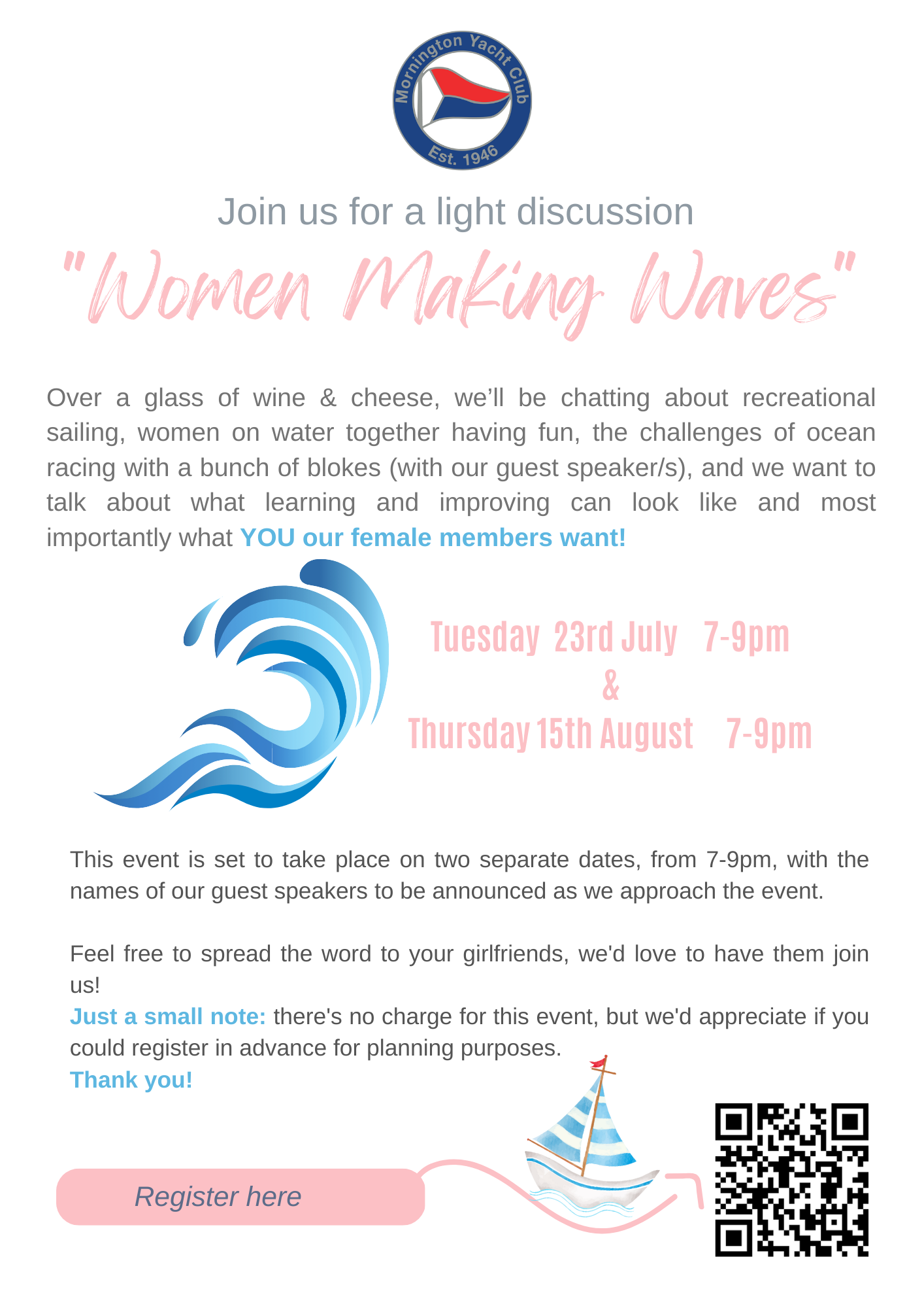 There are no age boundaries to sailing, and even those with reduced Mobility can sail through the Sailability program - girls, women, mums, grandparents and its and inclusive all gender sport.